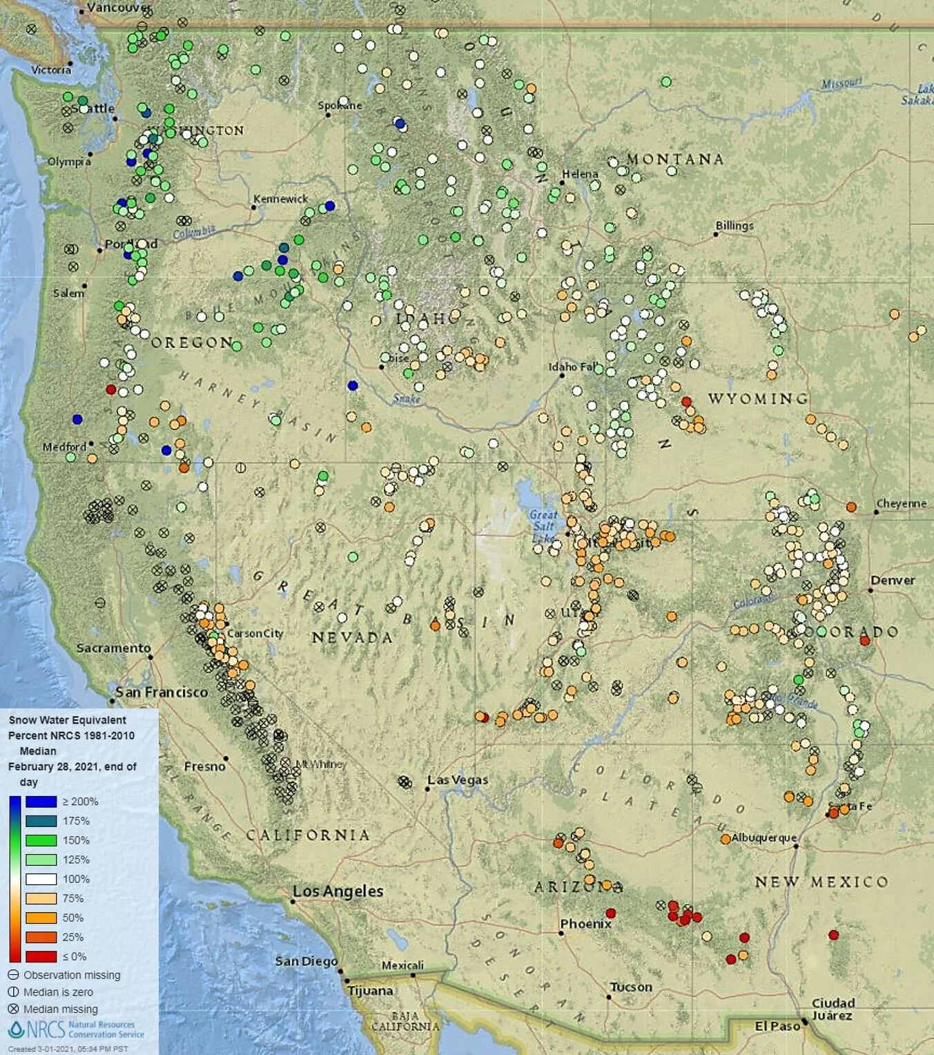 as of 1 March 2021. At a glance the Cascades and northern Rockies are average to well above average while the central and southern Rockies are average to well below average.