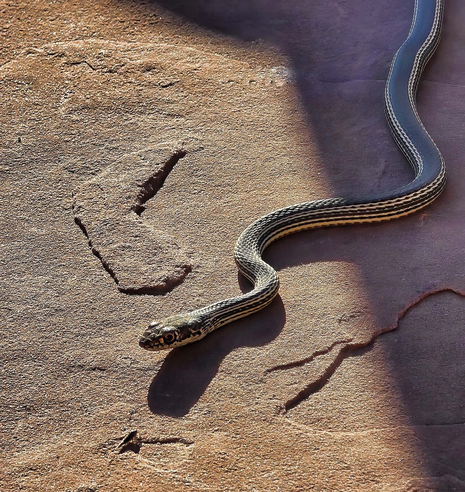 Soaking up residual warmth... John Buchanan October 7, 2025 from a sandstone slab as the sun sets. Striped whipsnake (Masticophis taeniatus).