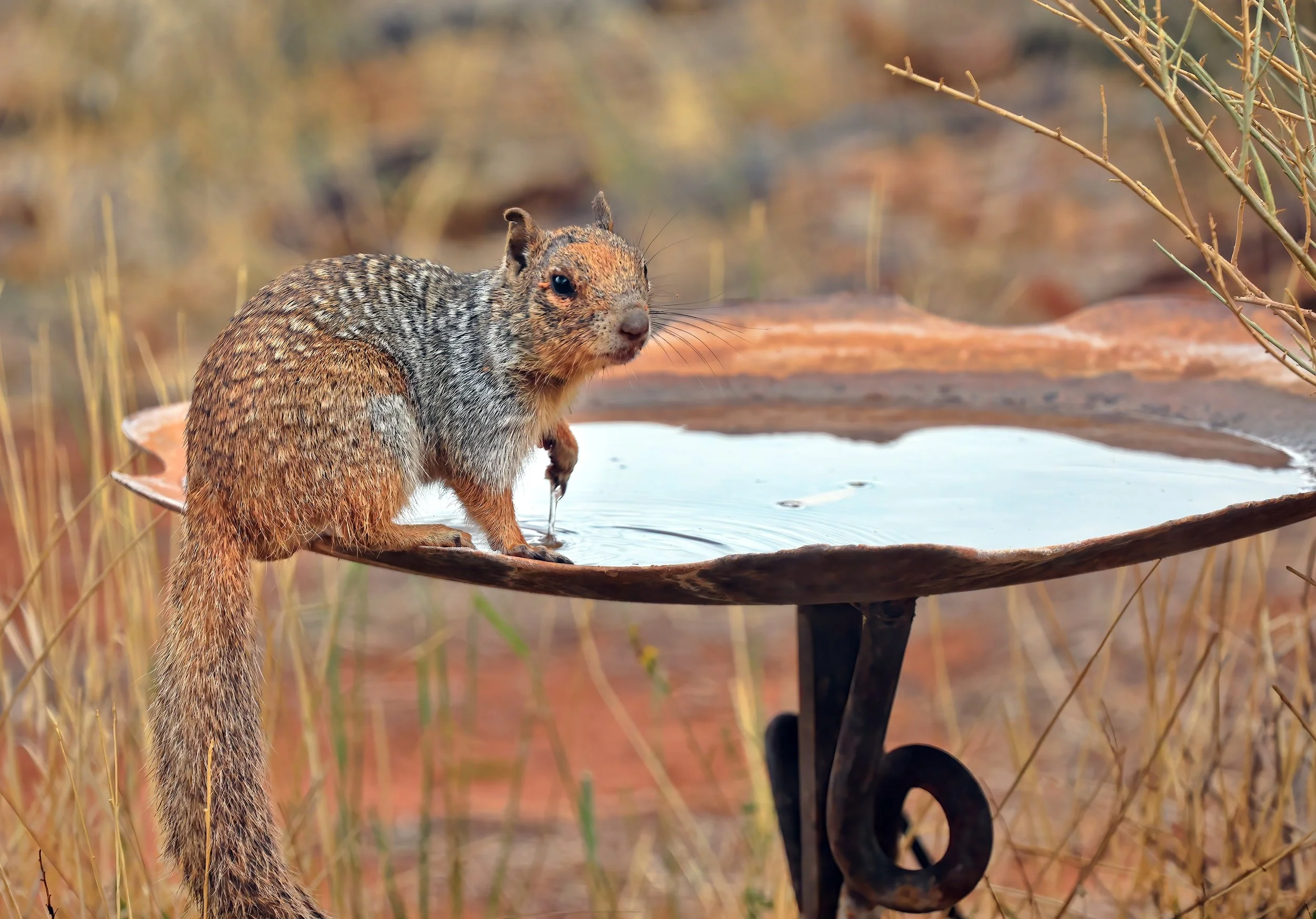 the replenished feeding stations while the rock squirrels enjoy the bath.