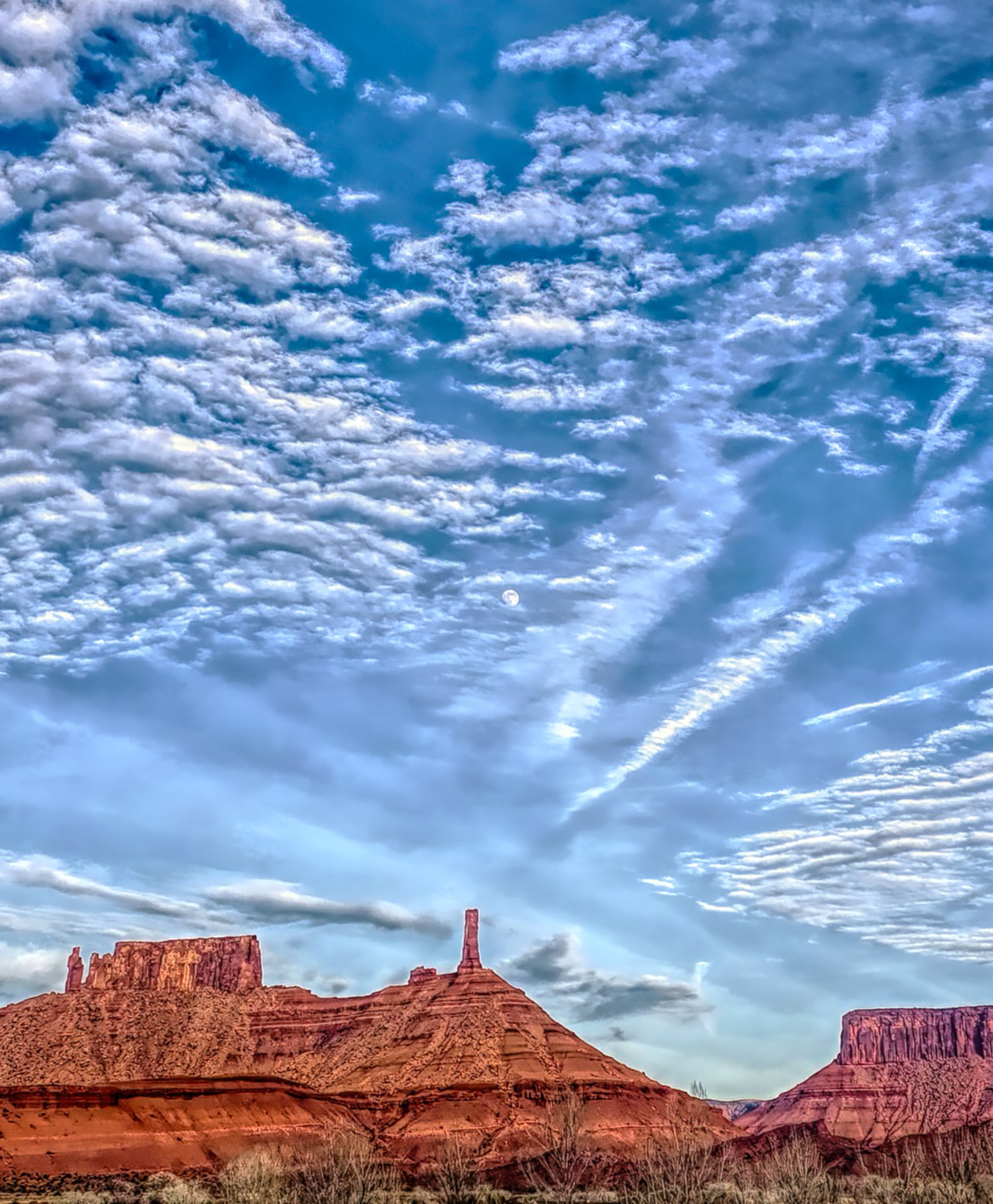 under very dry and mild conditions with an unimpressive snowpack in the high country. Look closely, the rising waxing gibbous Moon can be seen in the center of this image.