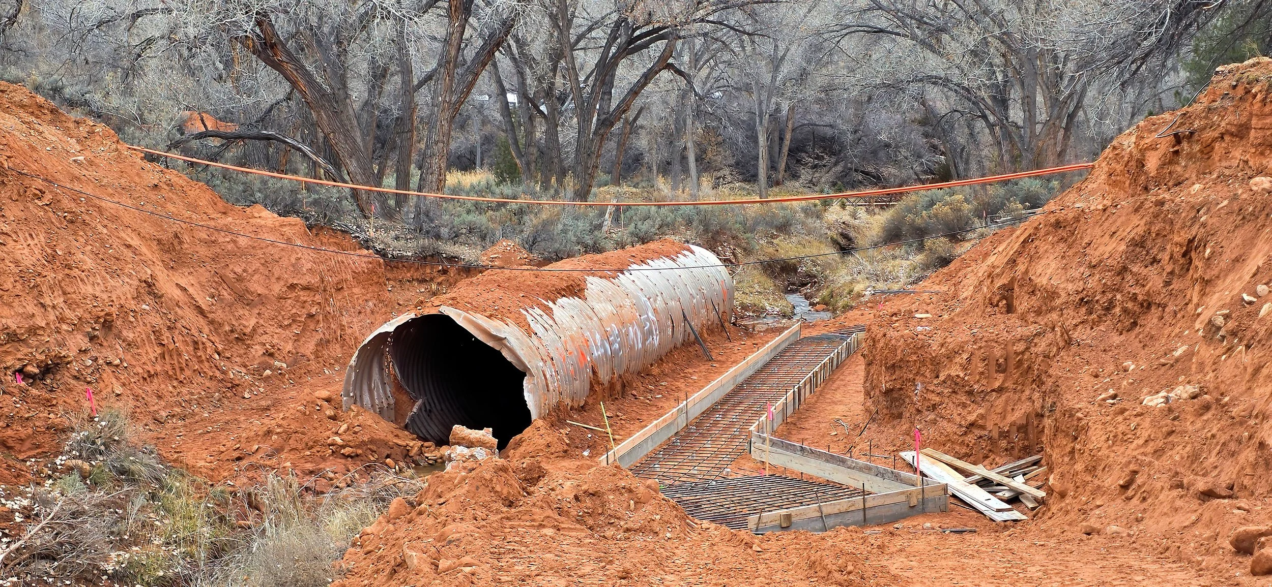 in replacing the culvert beneath Castle Valley Drive, now three weeks into the two month-long project. Castle Creek still flows through the existing corrugated steel culvert, now fully exposed, while footings are prepared alongside for the new arch culvert.