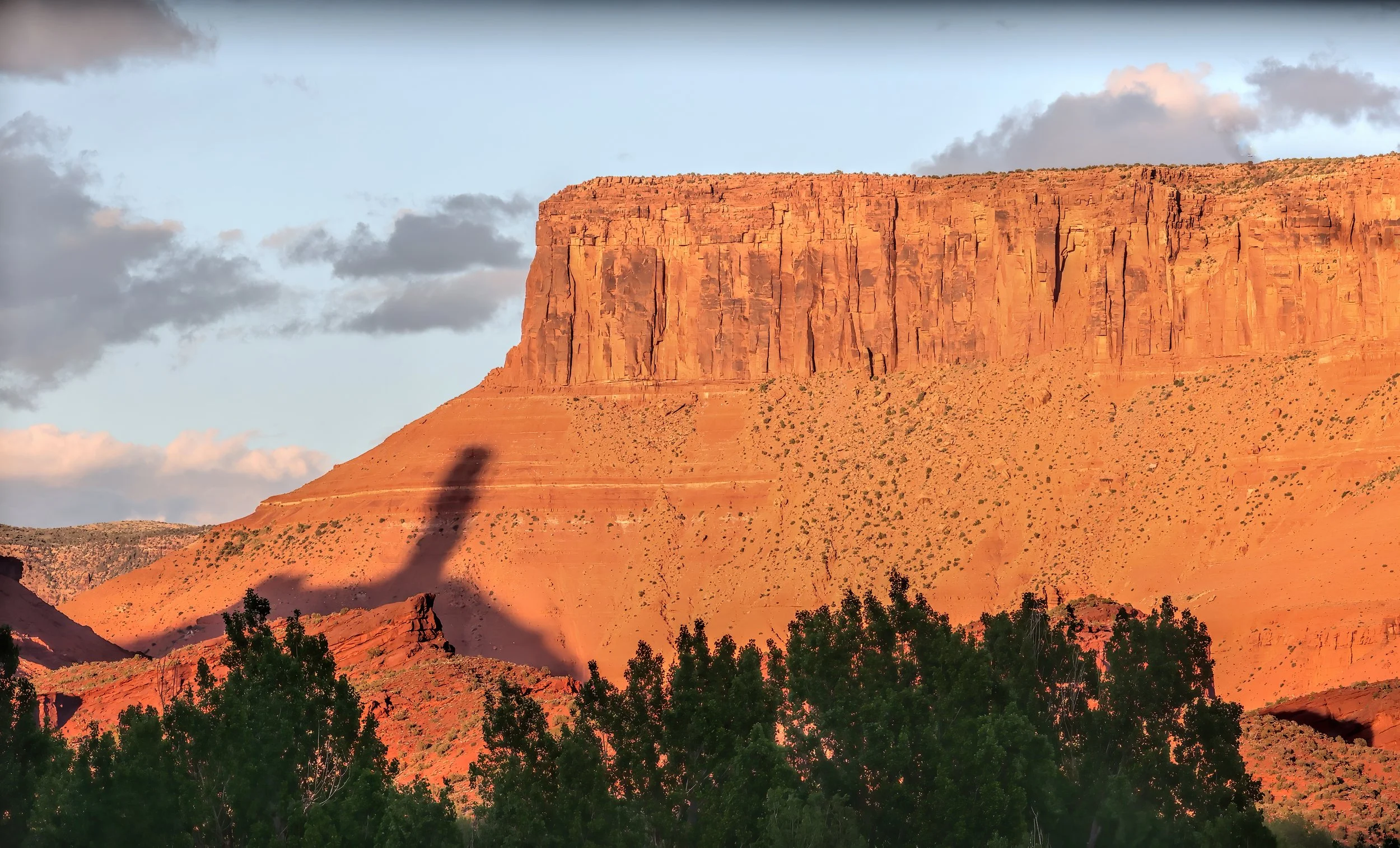 commences its seasonal rightward march across the face of Adobe Mesa at sunset, achieving its furthest rightmost position on the summer solstice in June.