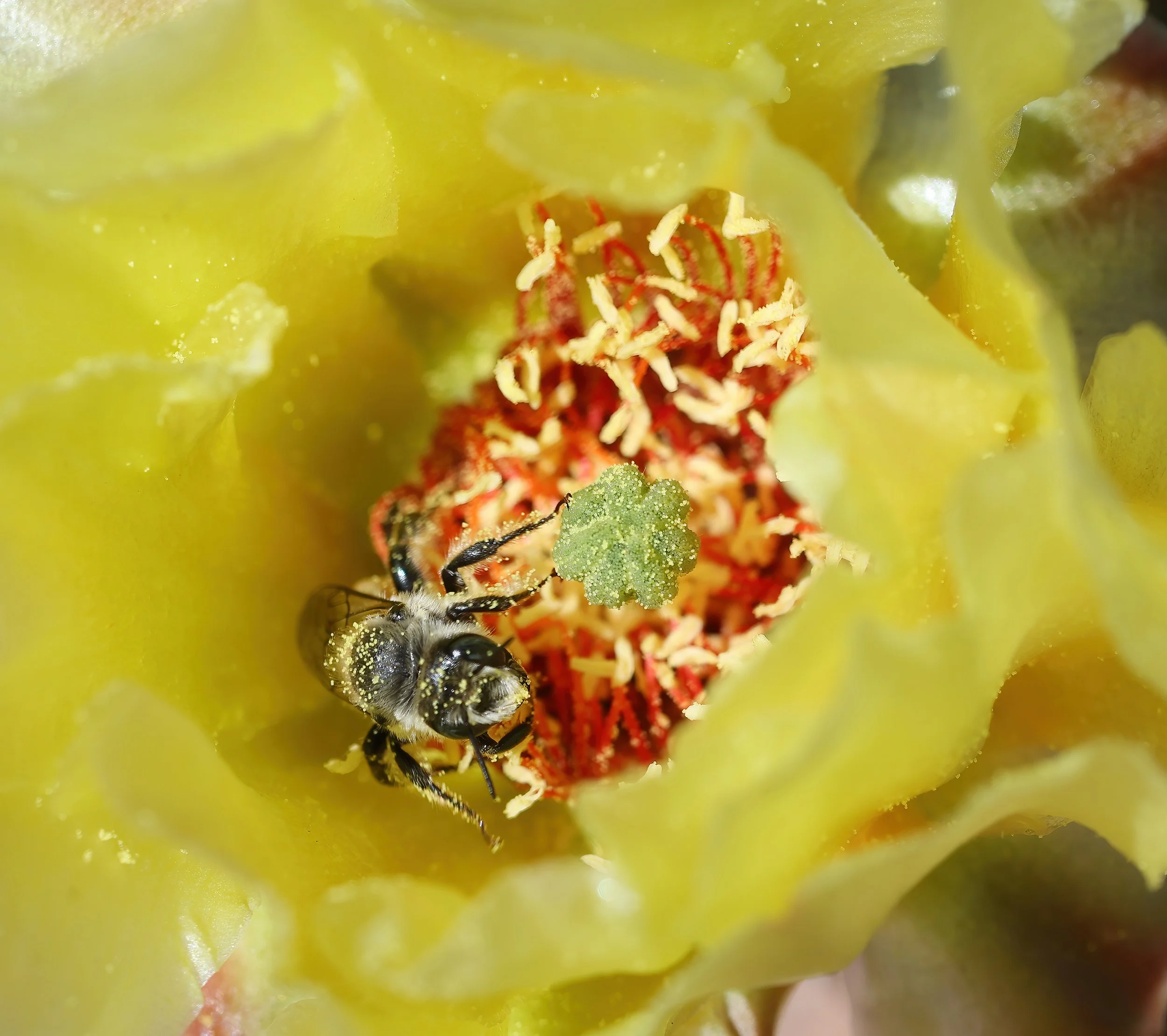 Let's get small... John Buchanan April 28, 2026 inside the blossom of a prickly pear cactus as the bees do their thing this time of year.