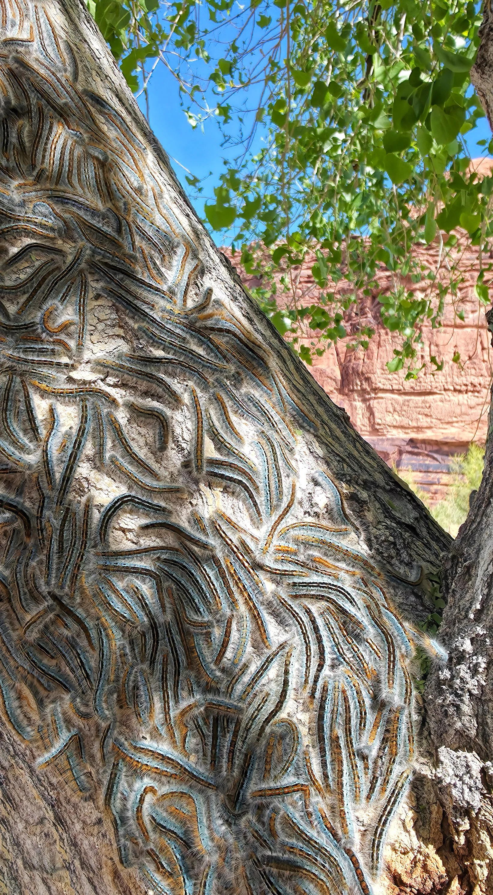 The stuff of nightmares... John Buchanan April 7, 2026 found crawling on the trunk of a cottonwood tree at Lions Park. Western tent caterpillar (Malacosoma californicum).