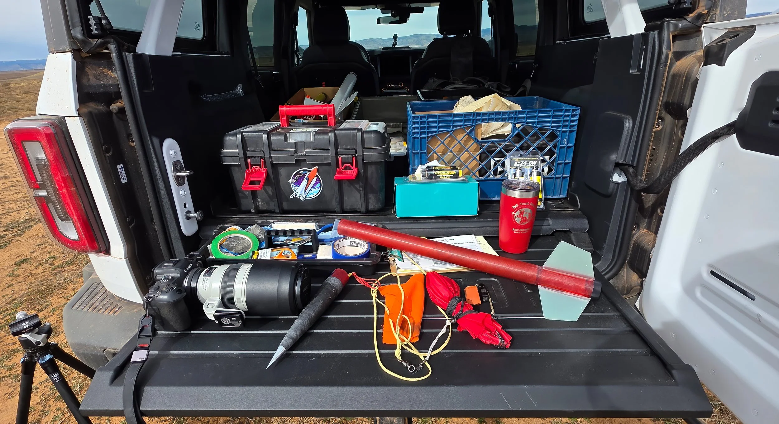 The slide out tailgate on the Bronco serves as a convenient workbench on which to prep rockets for flight.