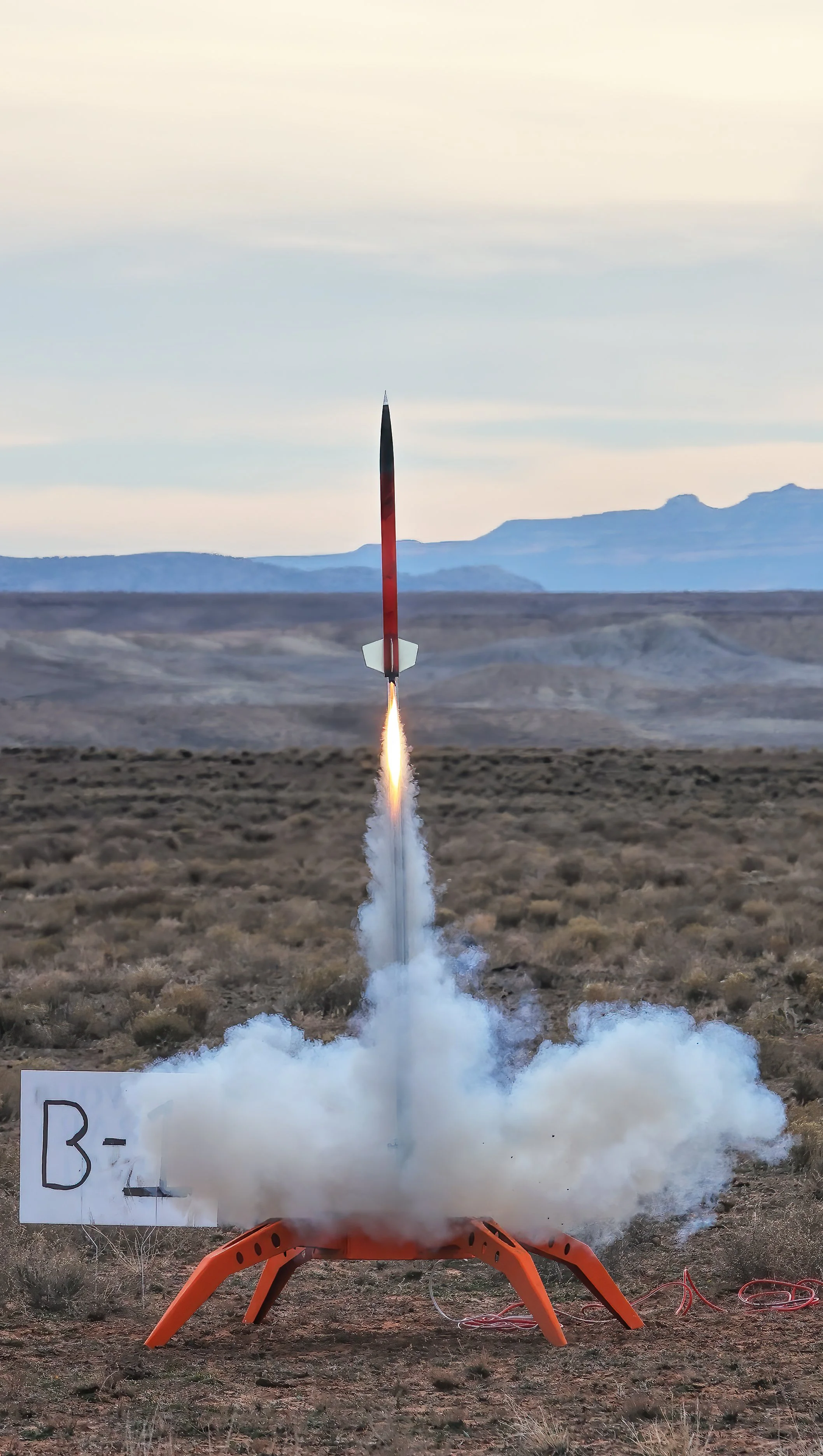 The exhaust plume of a high-power rocket paints its trajectory as it heads skyward with the Book Cliffs serving as a scenic backdrop to the remote launch site.